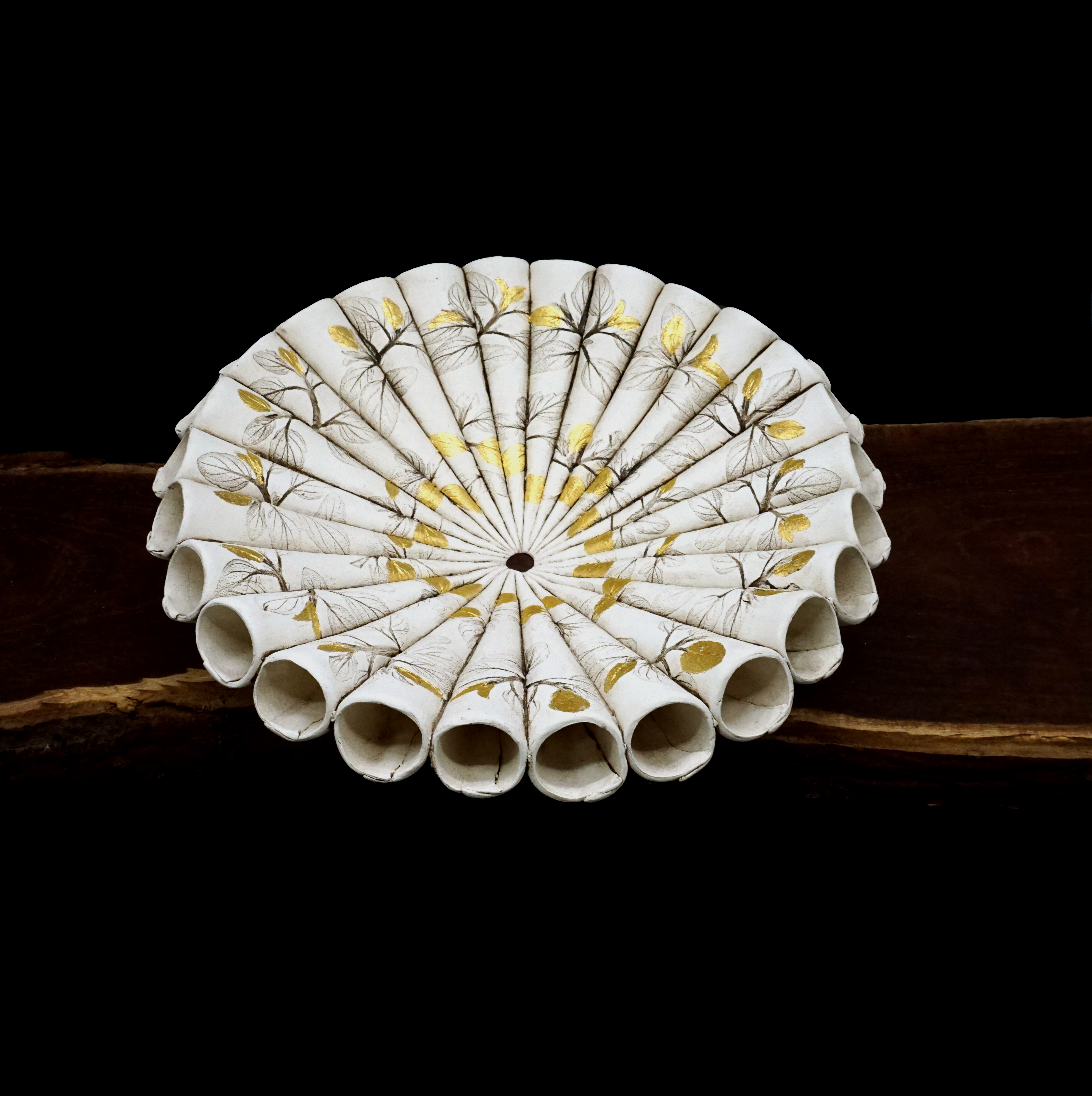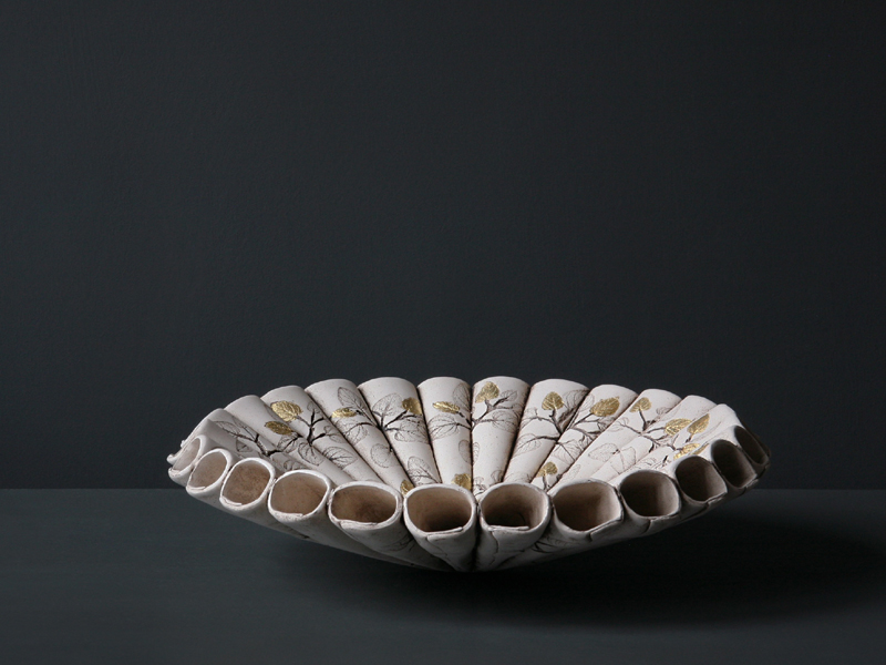 I wanted this piece to look as if the leaves could almost have been fossilized into the surface of the cones, to look as if it could have remained undiscovered on a forest floor for hundreds of years. Some of the leaves have been highlighted with 24ct gold leaf which catch the light.